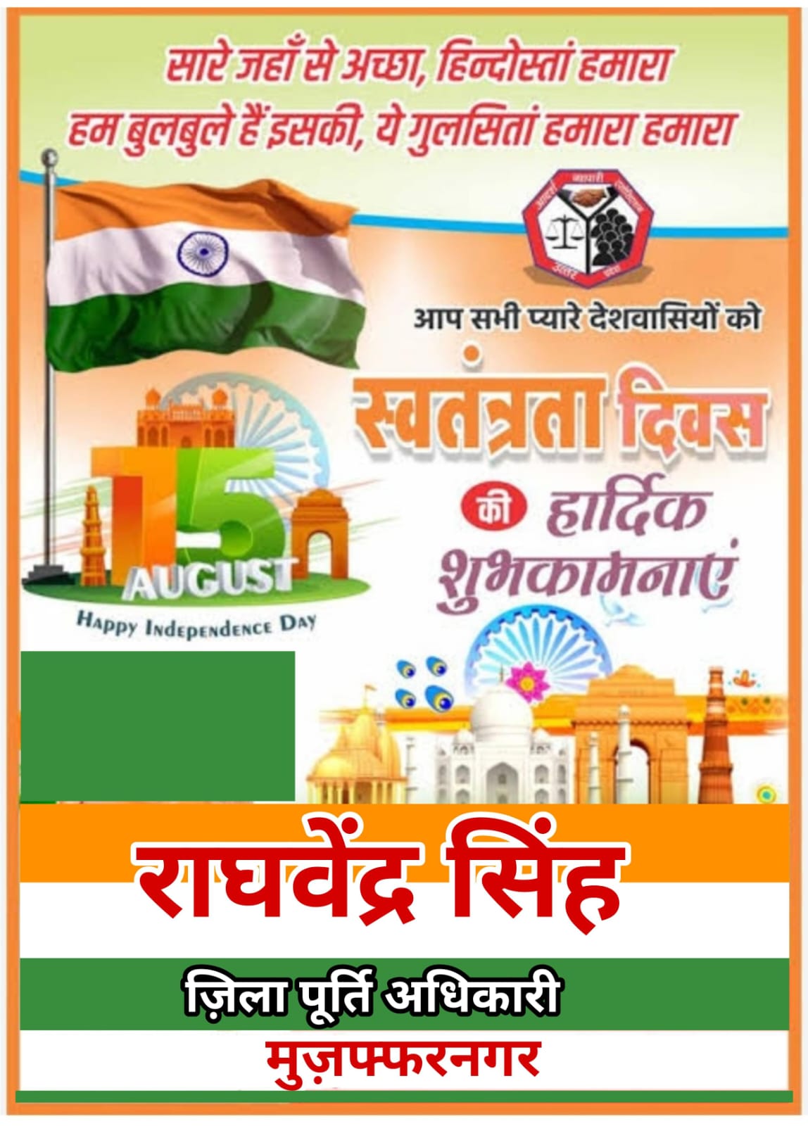 राघवेंद्र सिंह ज़िला पूर्ति अधिकारी मुज़फ्फरनगर की ओर से स्वतंत्रता दिवस की शुभकामनाएं। August 14, 2024 No Comments Read More »