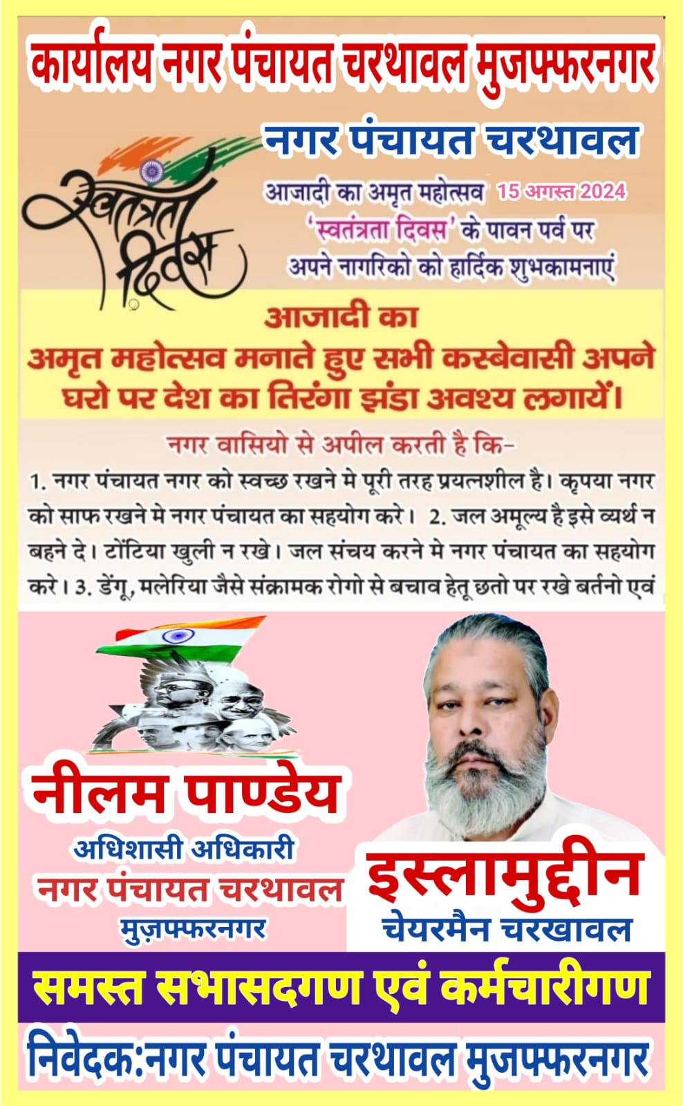 नगर पंचायत चरथावल मुजफ्फरनगर की ओर से स्वतंत्रता दिवस की शुभकामनाएं। August 14, 2024 No Comments Read More »